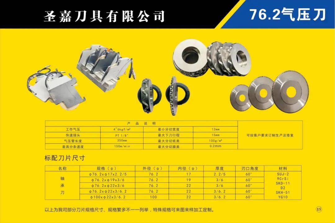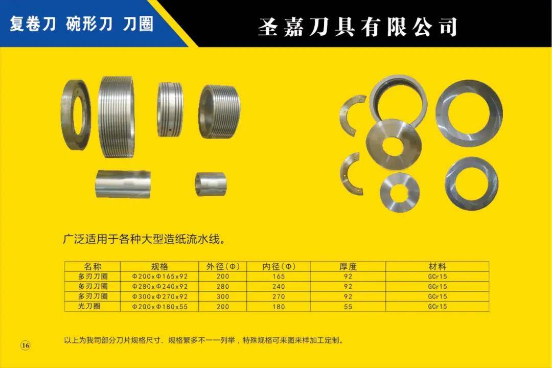 本公司所生產(chǎn)的各種型號(hào)規(guī)格分切、分條、分紙、復(fù)卷機(jī)圓刀片(蝶形上刀片、上刀架、下刀片、隔片、隔套、底棍、復(fù)卷刀、碗形刀、刀圈、大回旋圓切刀、砂輪、壓花輪、折疊刀、齒刀、異形刀)橫切刀、裁切刀、熱切刀、粉碎刀、切粒刀、撕碎刀、折頁(yè)刀、開槽刀、油墨刮刀、切臺(tái)圓刀、三孔刀、切管刀、氣壓刀組、剪切刀組、熱切刀組廣泛適用于造紙、紙制品加工、膠粘帶制品、薄膜、電線電纜、橡膠、輪胎、鋁箔、化纖、非織造布、復(fù)合包裝、卷煙、皮革、印刷、服飾輔料等行業(yè)。