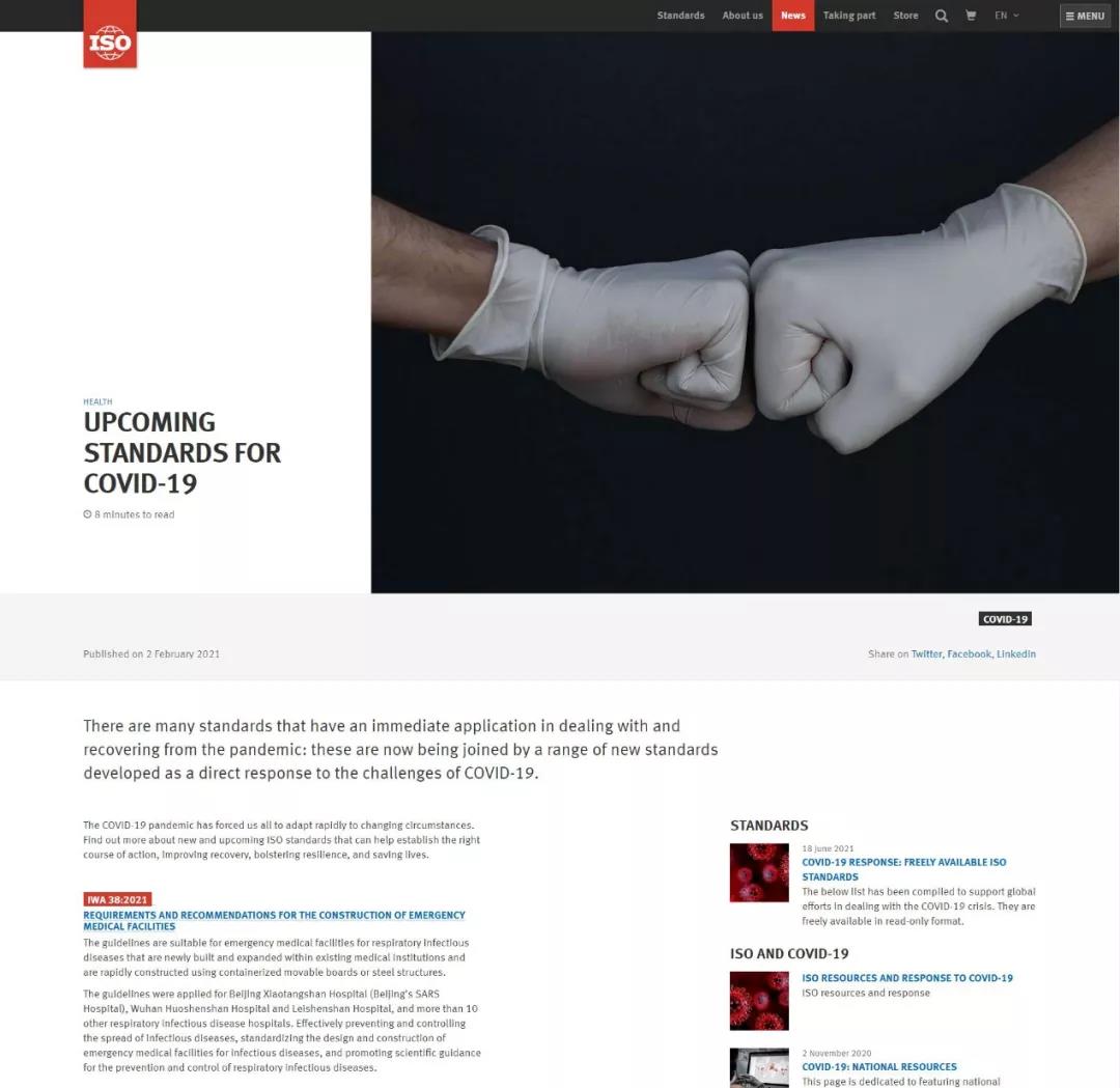 在此新冠肺炎疫情持續(xù)蔓延、亟待國(guó)際合作共同抗擊疫情之際,IWA 38《應(yīng)急醫(yī)療設(shè)施建設(shè)導(dǎo)則》作為ISO應(yīng)對(duì)新冠肺炎疫情的系列標(biāo)準(zhǔn)之一先行發(fā)布,為世界各國(guó)安全、適用、快速建設(shè)應(yīng)急醫(yī)療設(shè)施提供了有力的技術(shù)支持,為中國(guó)乃至世界人類健康事業(yè)作出了巨大的貢獻(xiàn)。