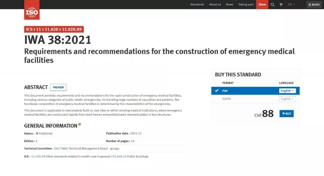 2021年12月20日,國(guó)際標(biāo)準(zhǔn)化組織(ISO)官方網(wǎng)站正式發(fā)布了中國(guó)中元牽頭提出的國(guó)際研討會(huì)協(xié)議IWA 38《應(yīng)急醫(yī)療設(shè)施建設(shè)導(dǎo)則》(以下簡(jiǎn)稱“《導(dǎo)則》”)。