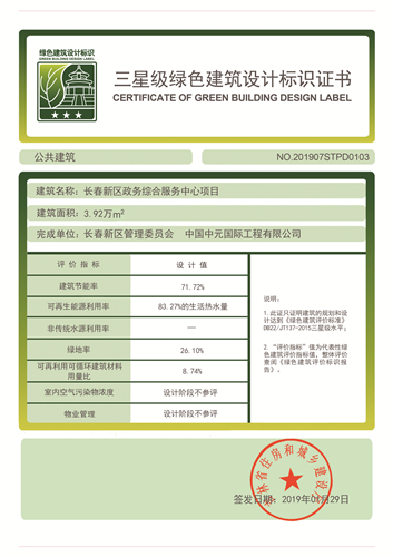 獲獎(jiǎng)情況:獲吉林省住房和城鄉(xiāng)建設(shè)廳頒發(fā)的三星級(jí)綠色建筑設(shè)計(jì)標(biāo)識(shí)證書(shū)